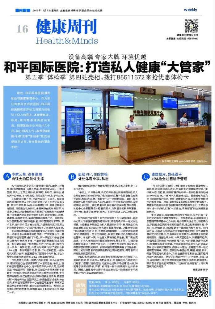最近,和平國際醫(yī)院推出體檢與健康管理中心。作為浙江首家臺資合資醫(yī)院,和平國際醫(yī)院在...