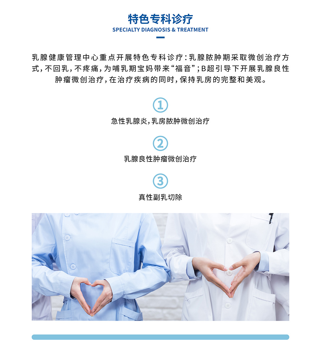 從女性乳房青春期發(fā)育異常,到成年常見(jiàn)的乳腺增生,到哺乳期好發(fā)的急性乳腺炎,到更年期好發(fā)的乳腺癌,對(duì)女性乳房健康的全生命周期健康管理。對(duì)乳腺疾病相關(guān)的學(xué)科,乳腺外科、整形美容科,婦科、內(nèi)分泌科,腫瘤科等相關(guān)學(xué)科進(jìn)行深度融合。以科學(xué)診療,個(gè)性化診療為特色,為女性乳腺健康保駕護(hù)航。