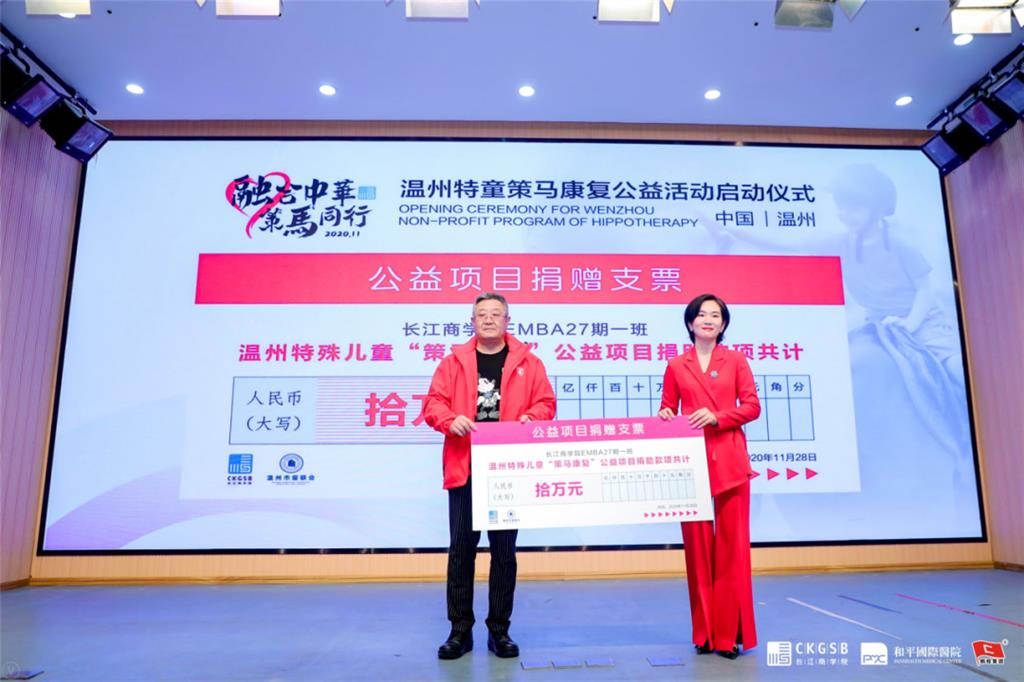 “無公益,不長江。”作為此次活動(dòng)的首批愛心捐贈(zèng)團(tuán)體,長江商學(xué)院EMBA27期一班同學(xué)此次共為“策馬康復(fù)公益”項(xiàng)目捐贈(zèng)10萬元愛心基金,由班級(jí)代表董非捐贈(zèng)。