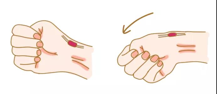 ●大拇指握在手心,向小指側偏手腕輕輕往下壓;