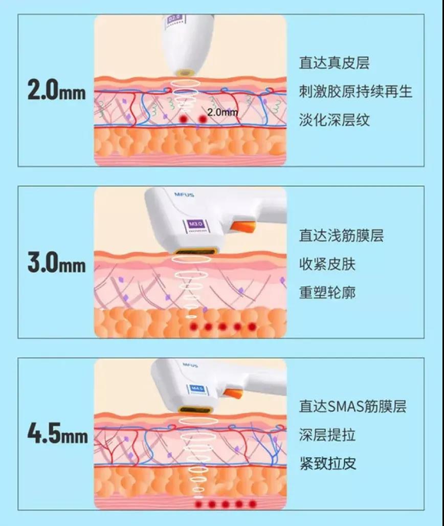 ① 半島超聲炮的治療頭有2.0mm、3.0mm、4.5mm三種深度,可以做到精準的分層抗衰。并且,治療時無痛無創(chuàng)、安全舒適,治療后效果顯著、無停工期。② 4.5mm筋膜提拉 直達SMAS筋膜,懸吊提升下垂皮膚軟組織,提升輪廓;③ 3.0mm緊致,直達皮下淺筋膜層,緊致皮膚并有選擇性地減少脂肪細胞,緊致塑形;④ 2.0mm淡紋,直達真皮層,刺激膠原持續(xù)再生,淡化深層紋。如頸紋、額紋、魚尾紋等。部分素材來源網(wǎng)絡(luò)