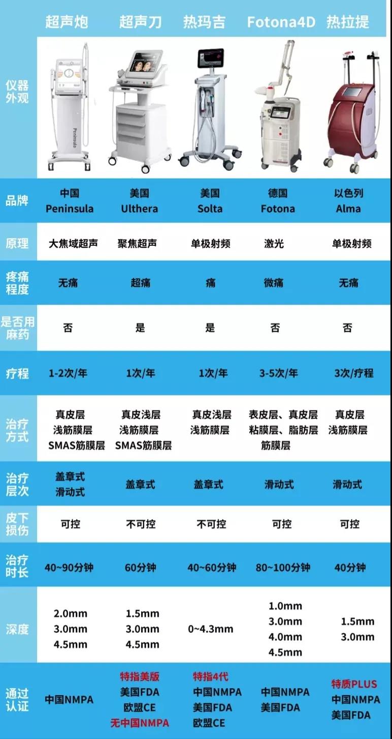 談不上“升級版”,超聲炮是國產(chǎn)半島家的儀器,而國內(nèi)一般說的超聲刀是指美版的超聲刀儀器。雖然同為“超聲”技術(shù),但同宗不同源。半島超聲炮是在傳統(tǒng)超聲刀的基礎(chǔ)上進行了優(yōu)化升級,采用和過去不同的大焦域方式,讓能量不斷的累積,利用超聲波能量精準加熱皮下SMAS 筋膜層、淺筋膜層、真皮層,熱能讓筋膜收緊,令老化的膠原蛋白收縮,并刺激膠原蛋白增生和重組,達到快速緊致皮膚,解決皮膚衰老導(dǎo)致的松、垂、皺紋等問題。體驗感更加舒適,而且更安全,不會損傷目標區(qū)域周圍的組織,所以才會通過NMPA的嚴格審核。兩種類型、三個深度的治療頭可以實現(xiàn)SMAS筋膜層、淺筋膜層、真皮層精準的分層抗衰。