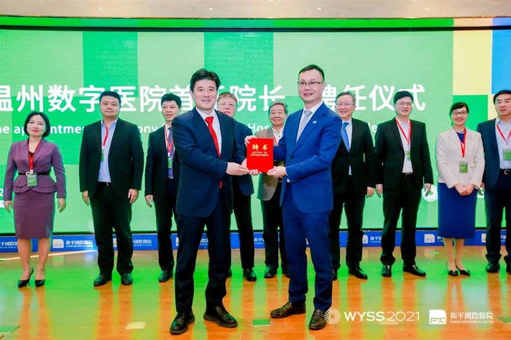 微醫(yī)集團總裁王陽為和平國際醫(yī)院院長薛志輝為頒發(fā)溫州數(shù)字醫(yī)院首任院長聘書。