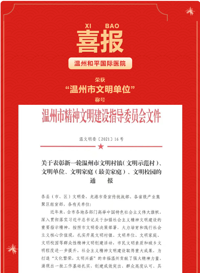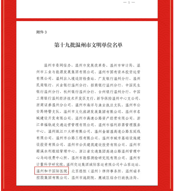 喜報丨和平國際醫(yī)院榮獲 “溫州市文明單位”稱號