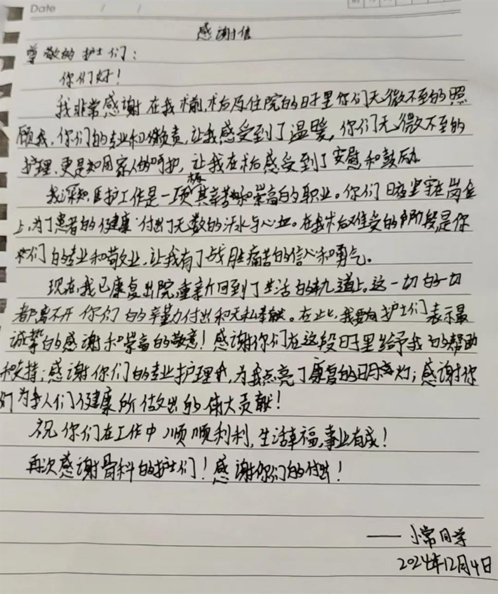 “是你們的專業(yè)和敬業(yè),讓我有了戰(zhàn)勝痛苦的勇氣和信心。”12月4日,經(jīng)過18天的術(shù)后治療與觀察,MDT專家團(tuán)隊(duì)多方面評估,初晨術(shù)后恢復(fù)良好,可以出院。出院時(shí),初晨親筆寫下兩封感謝信,交給了醫(yī)院整形外科主任劉斌和創(chuàng)傷與創(chuàng)面修復(fù)科的護(hù)士們。紙短情長,字里行間流露的真情打動了每一個(gè)人。