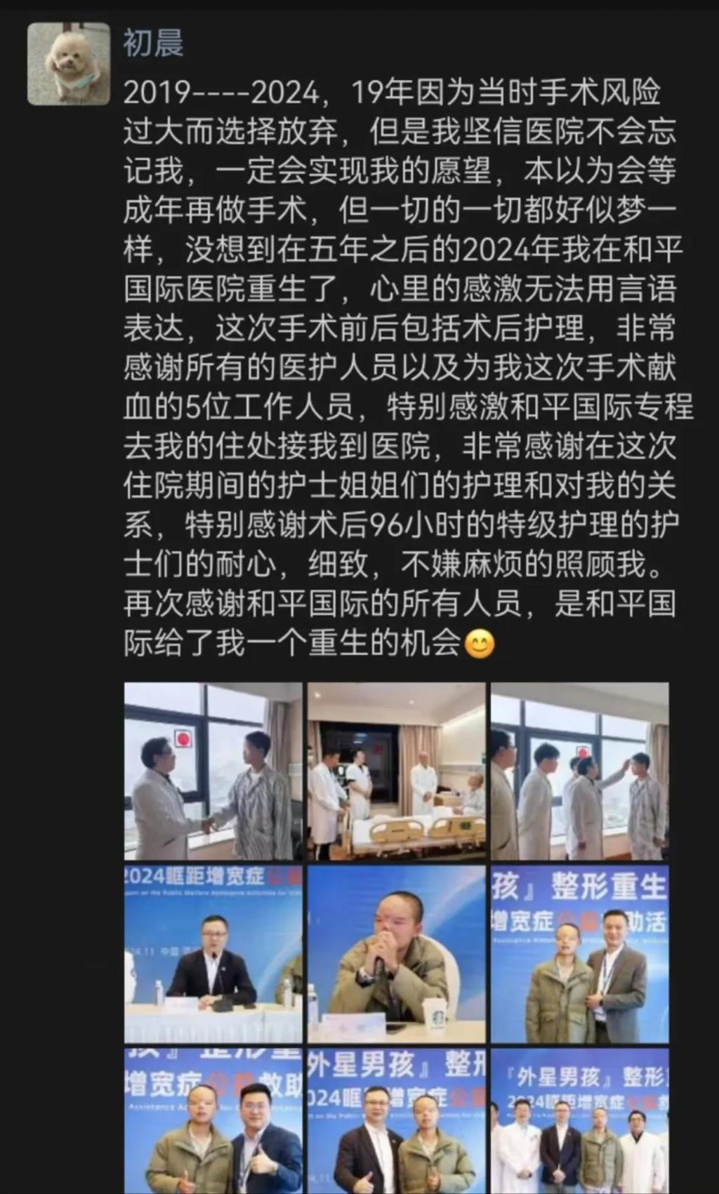 早晨,當(dāng)明媚的陽光灑進(jìn)和平國際醫(yī)院12樓病房,16歲的“外星男孩”初晨在微信朋友圈上寫下:趟過灘涂上大道,越過山地等高峰。在和平國際醫(yī)院“重生”后,我終于登上了屬于自己人生的珠穆朗瑪峰。