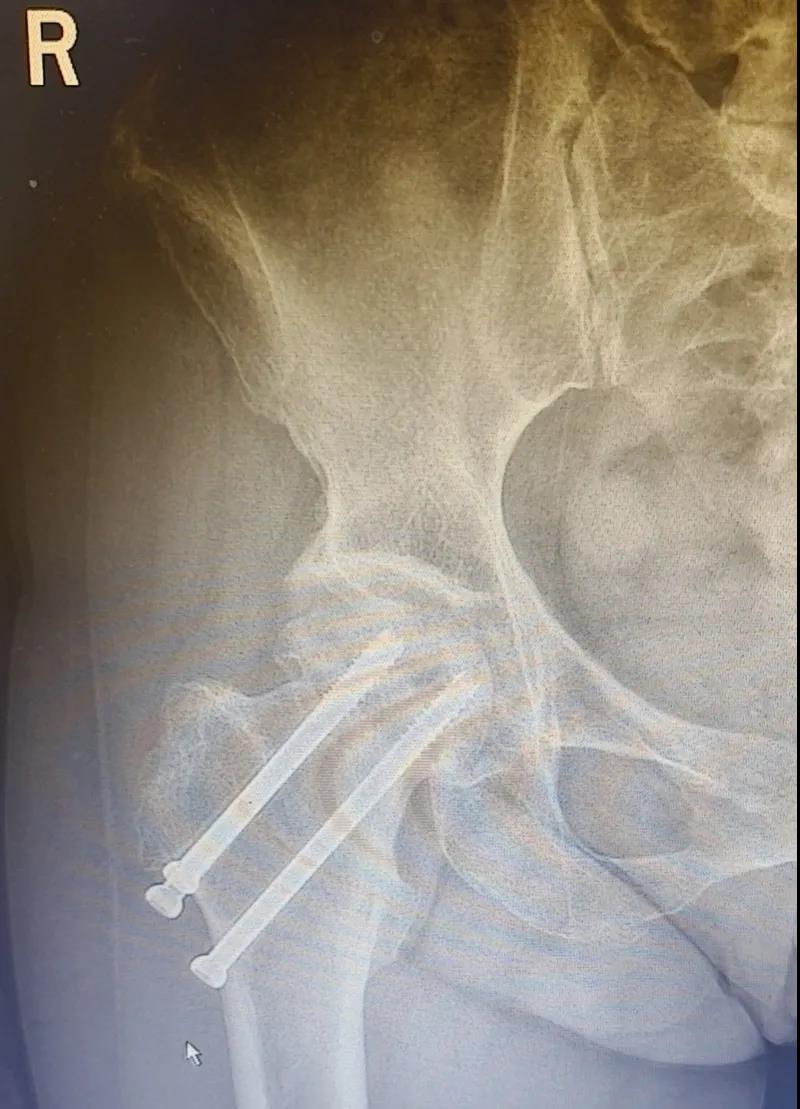 據(jù)李女士自述,自己于3年前因外傷致右股骨頸骨折,當(dāng)時在其他醫(yī)院做了右股骨頸骨折閉合復(fù)位螺釘內(nèi)固定術(shù),一年后右髖出現(xiàn)疼痛并逐漸加重,且休息不能緩解,行走時就像有座山壓身上一樣。結(jié)合病癥表現(xiàn)及影像顯示,李女士被診斷為“右股骨頸骨折術(shù)后股骨頭壞死”,需要盡快做手術(shù)。 (△術(shù)前影像,右股骨頸骨折內(nèi)固定術(shù)后股骨頭壞死)