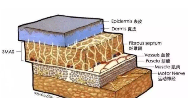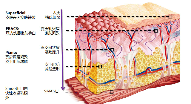 歐洲之星:內(nèi)外結(jié)合,層層深入,筋膜層、皮下脂肪層、真皮層、表皮層。