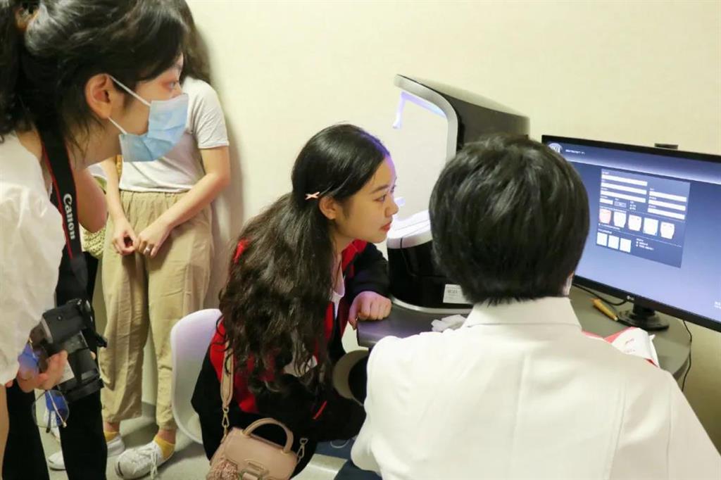 女同學(xué)們饒有興趣地體驗了VISA皮膚檢測。皮膚美容科主任吳麗微介紹了醫(yī)院的醫(yī)美設(shè)備和醫(yī)美項目,更是引起了同學(xué)們的聲聲驚嘆。