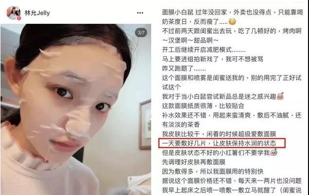 敷面膜已經(jīng)不是什么稀奇事了,睡前躺床上刷手機(jī)的時(shí)候敷上一張面膜,已經(jīng)成了很多人的必做工序。林允就曾在一篇分享自己護(hù)膚秘籍的小紅書(shū)中這樣說(shuō),“我皮膚比較干,閑著的時(shí)候超級(jí)愛(ài)敷面膜,一天要敷好幾片,讓皮膚保持水潤(rùn)的狀態(tài)。”